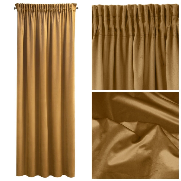 Delikatna w dotyku, salonowa welurowa zasłona w odcieniu miodowym z subtelnym połyskiem. Wielką uwagę do niej przykuwa staranne i estetyczne wykończenie. Oryginalna oraz wytworna dekoracja okienna do nowoczesnych, jak i klasycznych wnętrz. Świetnie wkomponują się w sypialniane lub salonowe okna.