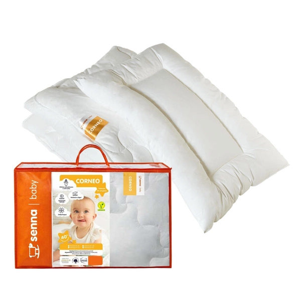 Biała, zdobiona przeszyciami przypominającymi trójkąty pościel dziecięca, dzięki którym zapewnia wielowymiarowość produktowi. Komplet składający się z poduszeczki i kołderki z włókien pozyskanych z kukurydzy zapewnia zdrowy sen. Pikowanie ma wartości funkcjonalne, które zapewniają dłuższą trwałość towaru. Wizualnie cieszy oko, natomiast praktycznie zapewnia komfortowy wypoczynek.