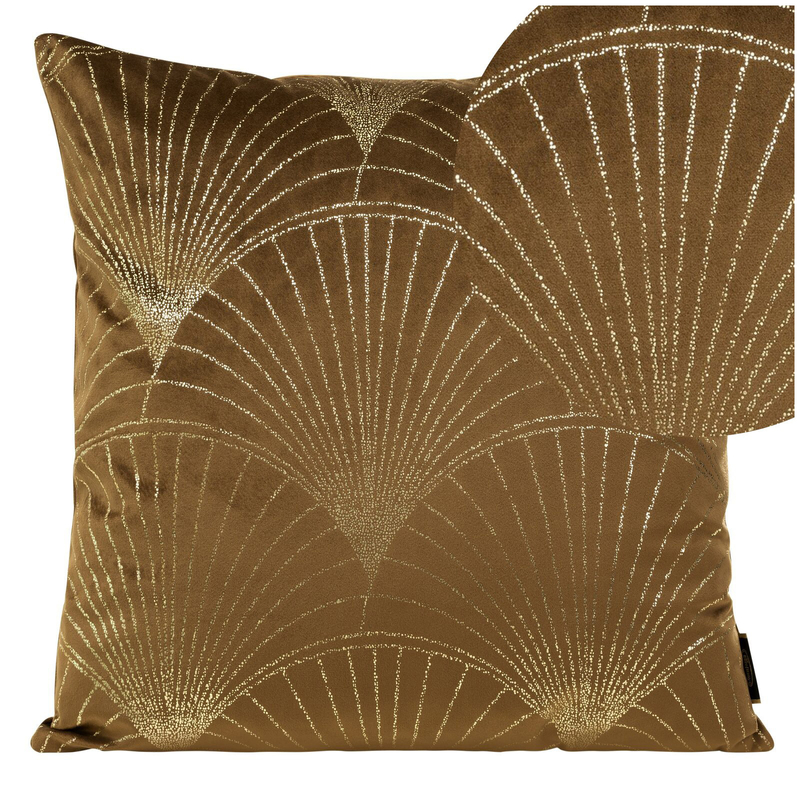 Poszewka Blink to gustowny dodatek, który odmieni aranżację każdego pomieszczenia, wprowadzając do niego styl i elegancję. Welwetowa tkanina, z której został uszyty produkt, sprawia, że miło się do niej przytulić i odpocząć po ciężkim dniu. Złote zdobienie, ukazujące motyw wachlarzy na brązowym tle prezentuje się bardzo oryginalnie. Druga strona jest jednolita. Poszewka pełni też funkcje praktyczne, gdyż jest świetnym oparciem, które pomaga się zrelaksować. Będzie również wyjątkową dekoracją na kanapie w salonie czy sypialni. Wszyty zamek błyskawiczny sprawia, że zmiana poszewki jest bardzo prosta.