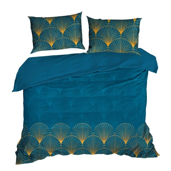 Komplet pościeli Lotos od firmy Eurofirany, został zaprojektowany z myślą o klientach, którzy szukają nieszablonowych wzorów i dobrej jakości produktu. Makosatyna, z której została uszyta pościel, zapewnia jej niezwykłą miękkość i delikatność. Optymalna gramatura 125 g/m2 sprawia, że materiał jest na tyle gruby, aby zapewnić odpowiednią trwałość i ciepło przy jednoczesnej lekkości i delikatności. Wzór, ukazujący kwiaty lotosu w niebieskim i złotym kolorze tworzy piękną i harmonijną kompozycję, idealnie współgrając z turkusowym tłem.